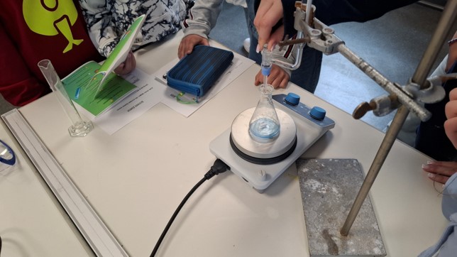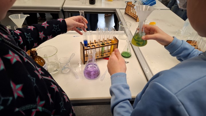 In den Fachräumen der Gesamtschule erwarteten die Grundschulkinder zahlreiche Mitmach-Stationen. Während im Bereich Physik das Thema „Kräfte und Gleichgewicht“ im Mittelpunkt stand, konnten die Kinder an fünf chemischen Experimentierstationen unter anderem zu Säuren und Basen sowie zu Kohlenstoffdioxid und dessen Bedeutung für das Klima forschen.
