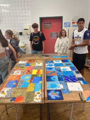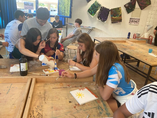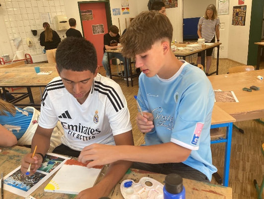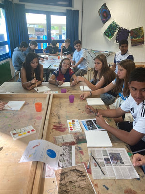 Zudem wurde auch über die Umsetzung von Austausch-Merch gesprochen und konkrete Gestaltungsideen umgesetzt. Ein großer Dank geht an die Schüler:innenfirma, die den Druck der Kleidungsstücke übernimmt sowie die Gastgeschenke vorbereitet.